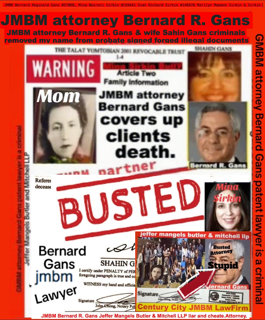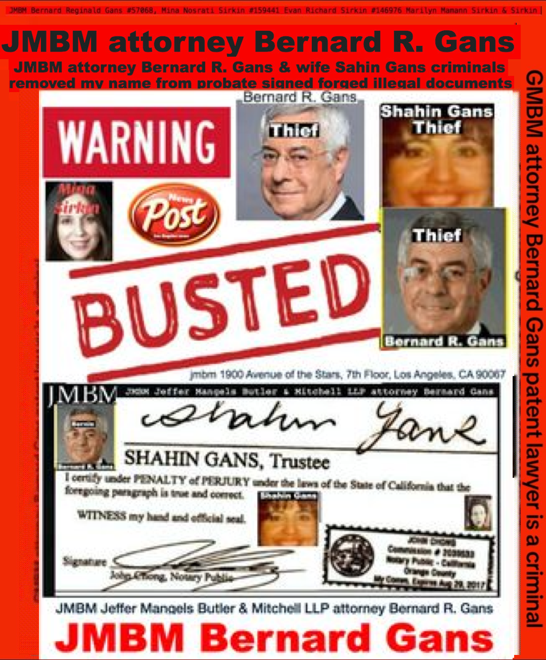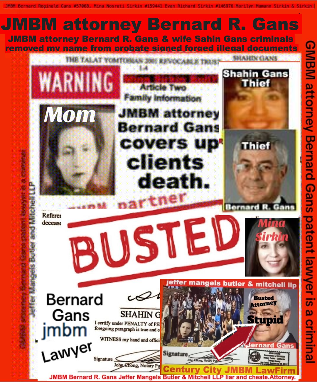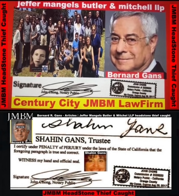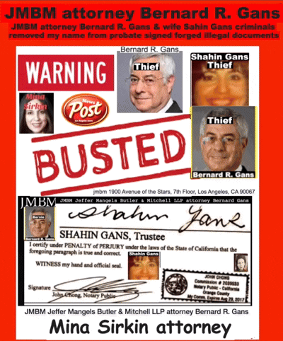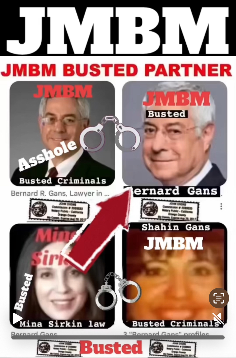 76 year old Century city JMBM busted attorney Bernard Reginald Gans known as Bernie graduate of Santa Barbara university married to Shahin Gans 50 years of success to satisfy his wife he made one stupid mistake and it all crashed down. Well done Bernie well done.Bernard R Gans Articles Jeffer Mangels Butler & Mitchel LLP 76 year old Century city JMBM busted attorney Bernard Reginald Gans known as Bernie graduate of Santa Barbara university married to Shahin Gans 50 years of success to satisfy his wife he made one stupid mistake and it all crashed down. Well done Bernie well done.Bernard R Gans Articles Jeffer Mangels Butler & Mitchel LLP