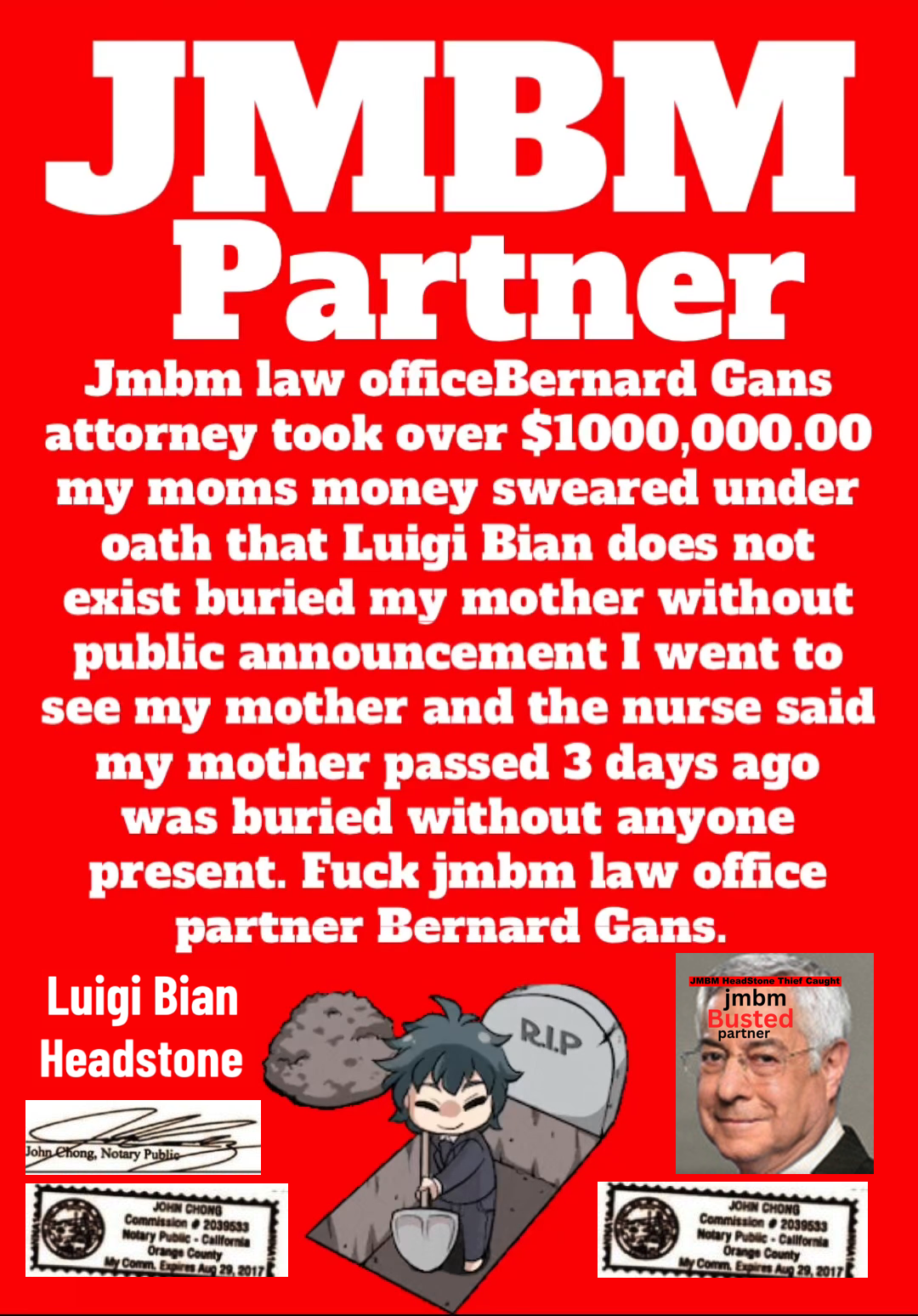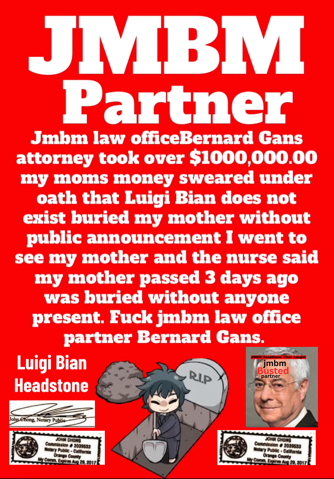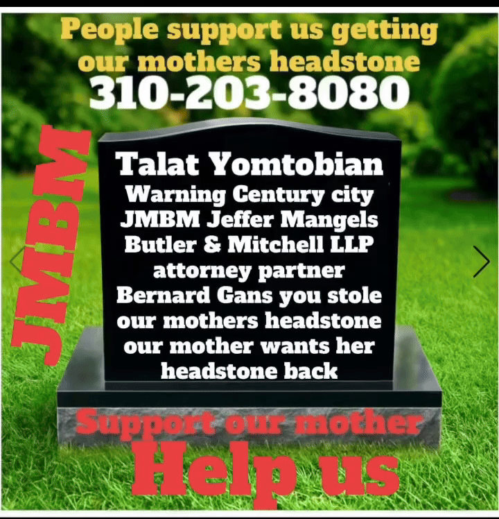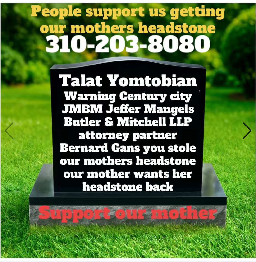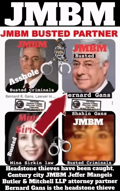 Century City Police 90067 Department JMBM attorney Jeffer Mangels Butler & Mitchel LLP JMBM attorney thief you have 24 hours to place the headstone or we are going to Century City Police department to report your crimes.